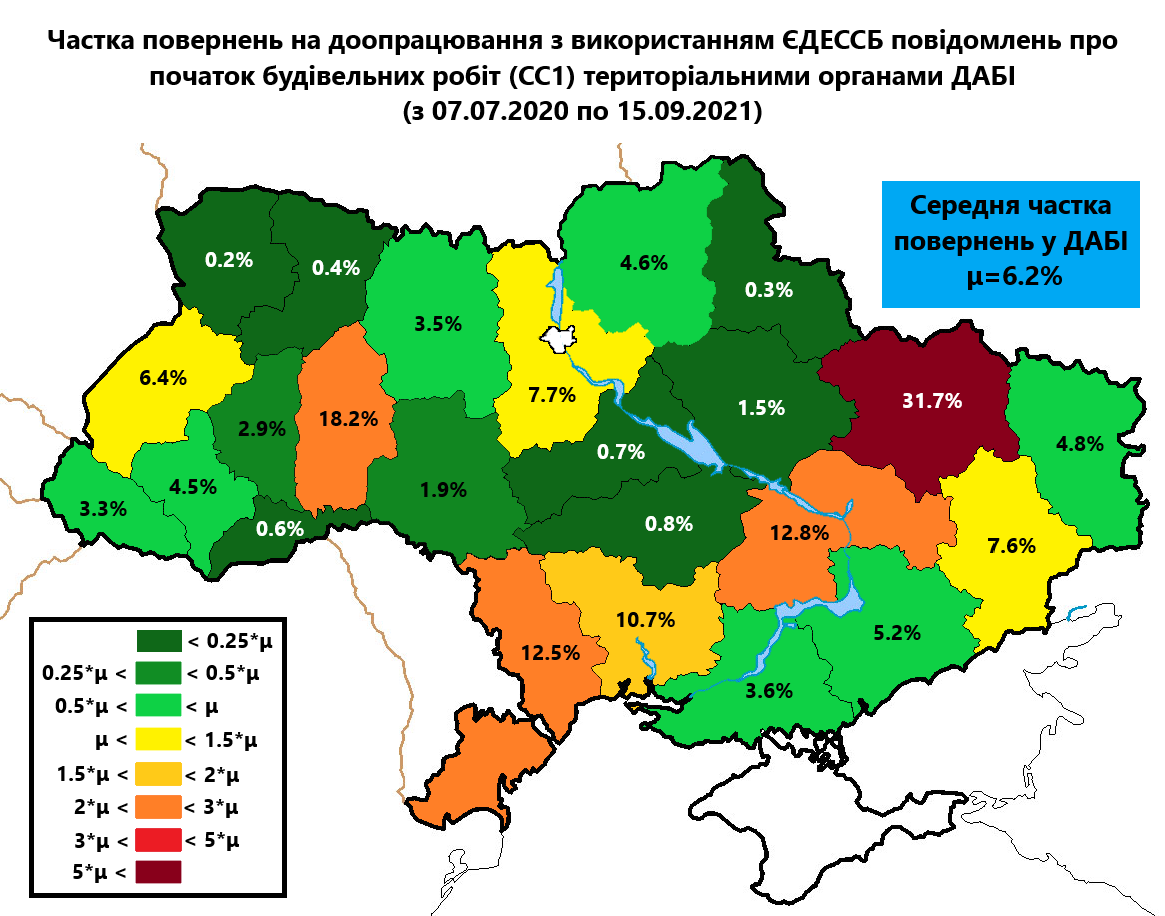 За даними ЄДЕССБ, у середньому за трохи більше 14 місяців до ліквідації ДАБІ (з 07.07.2020 до 15.09.2021) повернення на доопрацювання випадало приблизно у 6,2% результатів розгляду повідомлень у ДАБІ та 10,9% — в органах ДАБК при ОМС. Як свідчать дані, ДАБІ навіть у сфері будівництва не була найбільш корумпованим органом з цього питання і в півтора разу відставала від створених у процесі децентралізації органів на місцях.