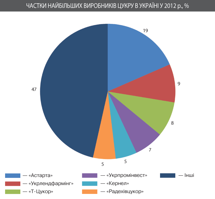 А настрої серед виробників досить різні. П'ятірка лідерів ринку 2012 р. склалася таким чином: "Астарта" Віктора Іванчика і Валерія Короткова зайняла 19% ринку, "Укрлендфармінг" Олега Бахматюка - 9%, холдинг "Т-Цукор" Івана Гути - 8%, "Укрпромінвест" Петра Порошенка - 7% і "Кернел" Андрія Веревського - 5% (див. рис.).
