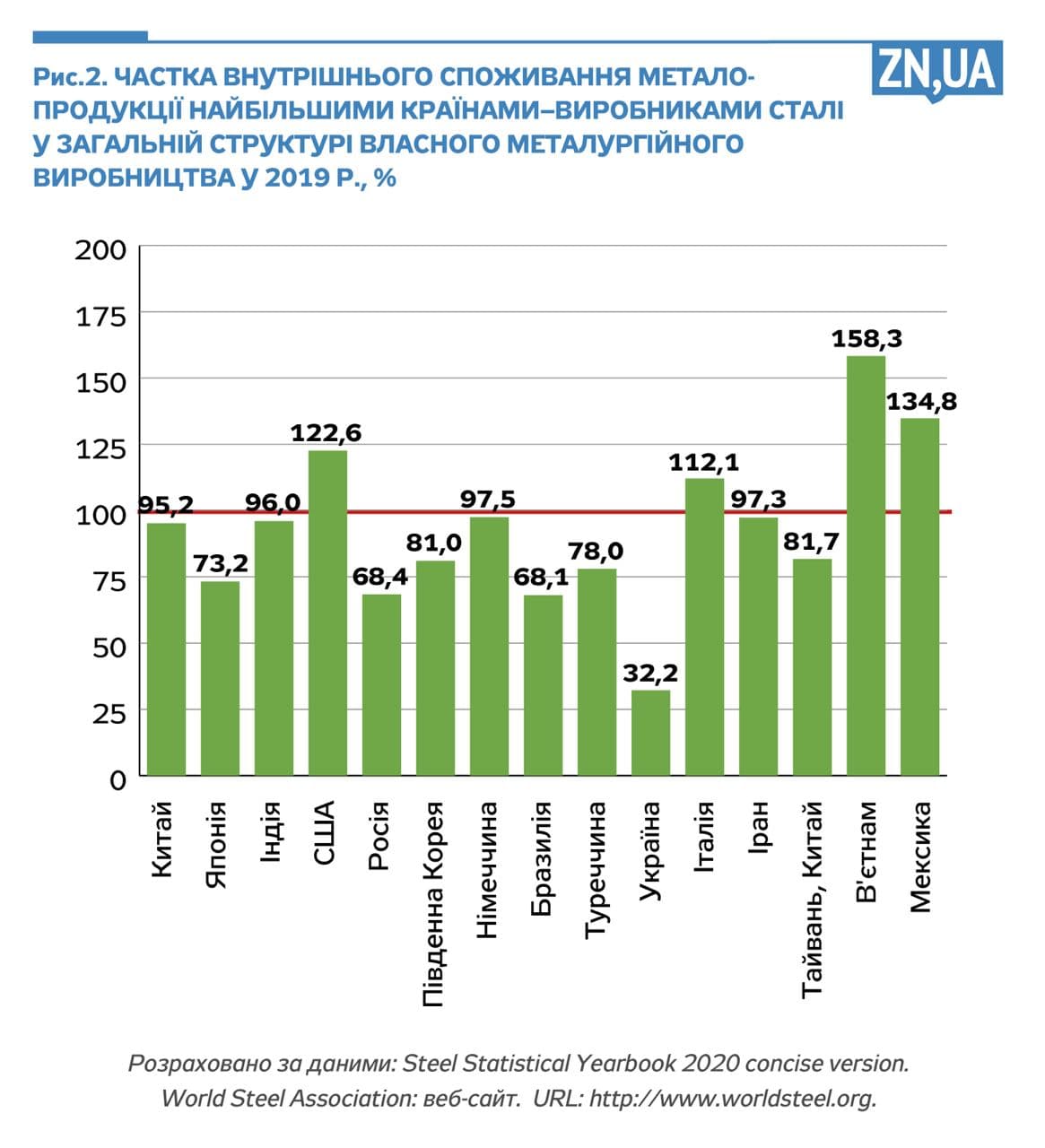 Високі обсяги експорту вітчизняної металопродукції зумовлені перш за все наявністю великої кількості виробничих потужностей і низькою місткістю внутрішнього ринку. Так, серед країн із ТОП-15 місткість внутрішнього ринку України є найнижчою — 32,2% (див. рис. 2).