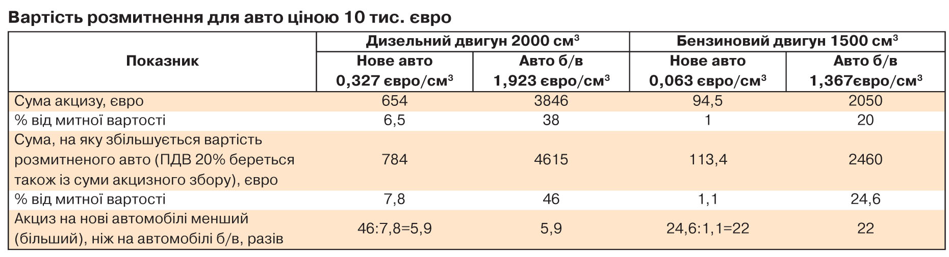 Тепер стосовно акцизного збору. Візьмемо для прикладу авто вартістю 10 тис. євро з такими показниками об'єму двигуна: для дизельного 2 л (від 1,5 до 2,5 л); для бензинового 1,5 л (від 1 до 1,5 л). Суми акцизу для 1 см3 об'єму двигуна візьмемо з відповідних таблиць Податкового кодексу та обчислені показники для наочності занесемо в таблицю. За бажання ці цифри легко перевірити.