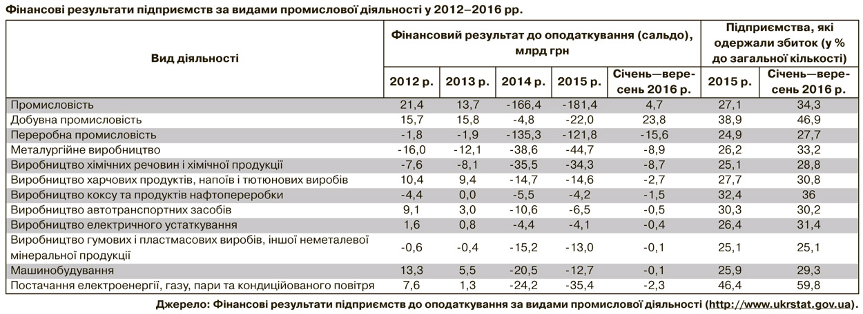 Масштаби втрат для економіки, зумовлені таким фінансовим станом промисловості, надто великі: якщо у 2014–2015 рр. фінансовий результат прибуткових підприємств у середньому становив 4,6–4,8% ВВП, а збиткових - 13,7–15,3% ВВП, то у підсумку сукупний від'ємний результат сягав 9,2–10,5% ВВП. Дані за дев'ять місяців 2016-го демонстрували деякі ознаки фінансового оздоровлення промисловості завдяки збільшенню прибутків у добувній галузі, тоді як переробна промисловість й енергетика залишаються обтяженими збитками.