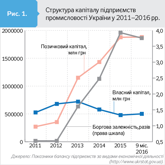В умовах нестачі доходів підприємства промисловості стрімко наростили борги. Упродовж 2013–2016 рр. обсяг залученого ними позичкового капіталу зростав у середньому на 70% щороку. Станом на вересень 2016 р. обсяг накопиченого боргу у 5,3 разу перевищив наявний у 2012 р. (рис. 1). Водночас власний капітал виробників скоротився на 30% - унаслідок одержаних збитків, припинення діяльності, втрати активів на окупованих Росією територіях. Середньорічний темп приросту позичкового капіталу становив 1231 млрд грн, а темп скорочення власного капіталу - 110 млрд грн. У результаті поєднання двох протилежних тенденцій - нарощування боргів і декапіталізації підприємств - рівень боргової залежності у промисловості наблизився до чотирьох (у стільки разів борги перевищують власний капітал), тоді як звичайний її рівень у країнах, що розвиваються, принаймні втричі менший.