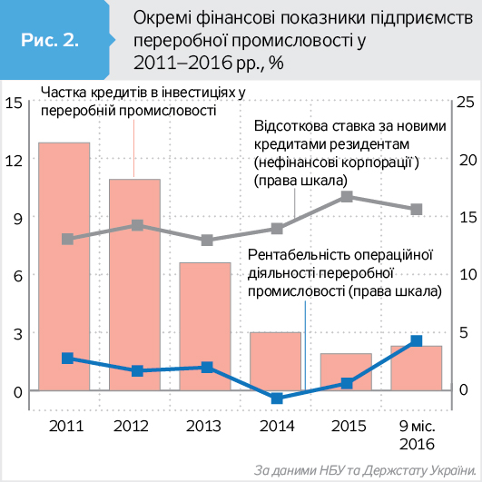 Підприємства промисловості (особливо переробної) у своїй інвестиційній активності майже повністю відлучені від фінансового ринку. Так, частка кредитів в інвестиціях у переробну промисловість скоротилася до 1,9% (2015 р.), тоді як ще 2011-го вона становила 12,8% (рис. 2). У низці галузей переробної промисловості взагалі припинено використання позикових і залучених коштів у виробничих інвестиціях. Недоступність позикових коштів зумовлена передусім дорожнечею кредитних ресурсів. Ставки за банківськими кредитами перевищують рентабельність промислової діяльності у чотири рази і більше (рис. 2). Відсоткову політику центрального і комерційних банків слушно оцінюють як механізм вибудовування стіни між банками і виробництвом, що закриває перспективи зростання і для економіки, і для банків. Відповідно, велика частина промислових підприємств не має "платоспроможного" попиту на кредити та потерпає від нестачі інвестицій.