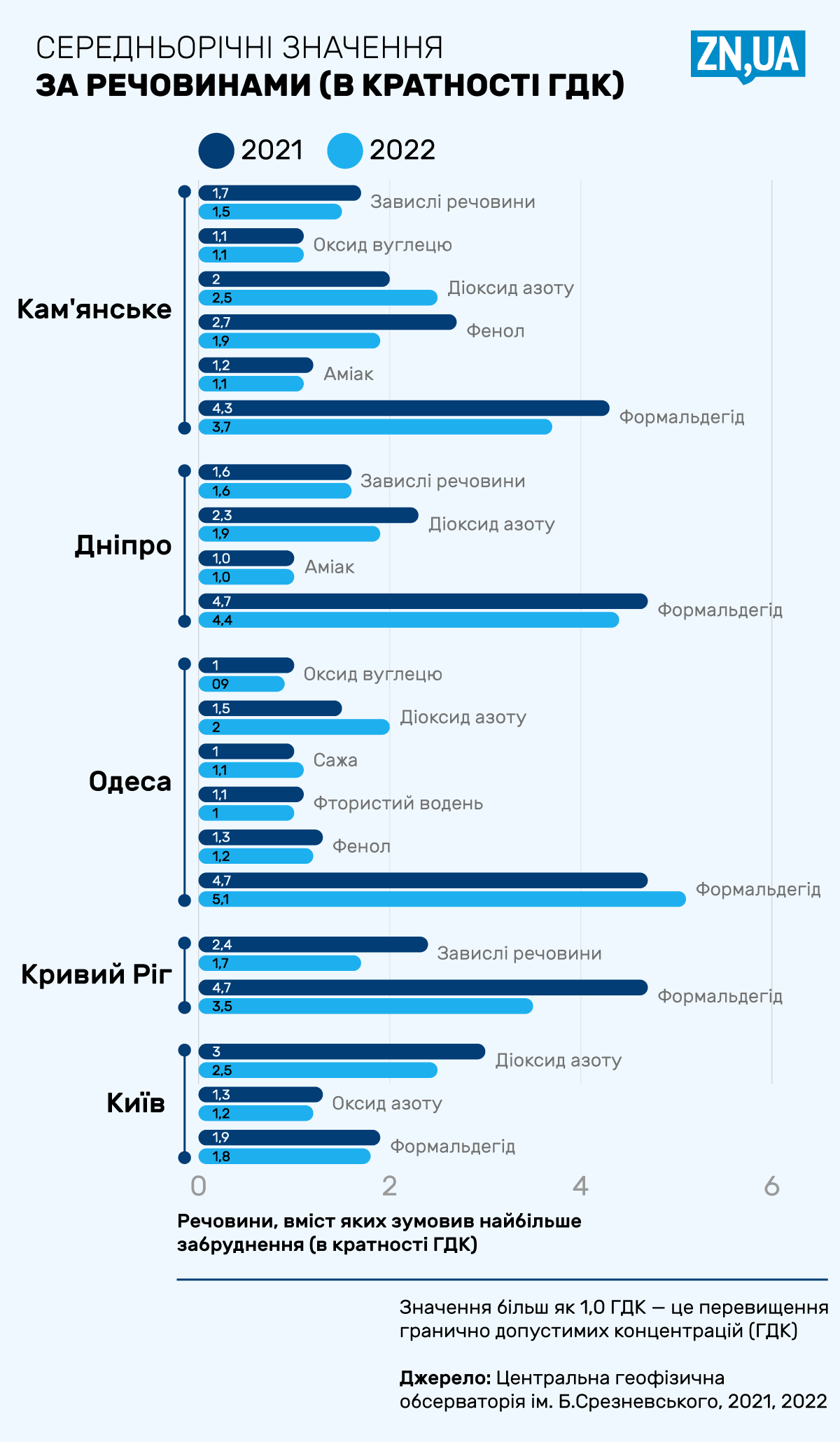 Він пояснив, що кожне місто має свої проблемні речовини, які найбільше забруднюють повітря. Цей “профіль” якісно не змінився в 2022 році, за ним зберігається перевищення гранично допустимих концентрацій (ГДК).