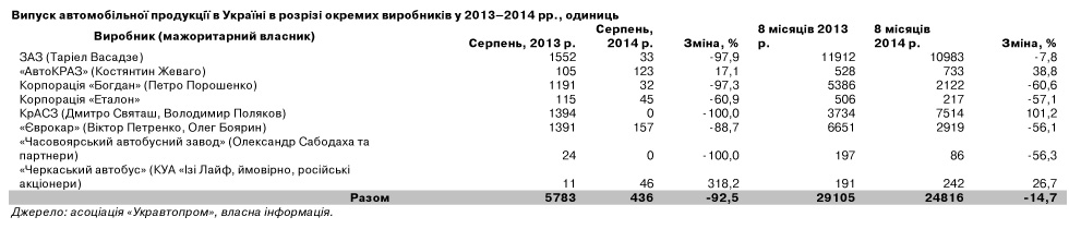 Український автопром надовго запам'ятає літо й осінь 2014 р. Галузь переживає шок від війни на Сході країни. У серпні виробництво автомобілів упало до непристойного мінімуму, лише до кількох сотень штук. Таких обсягів галузь не демонструвала навіть у кризові 2008–2009 рр. Чотири найбільші заводи практично зупинили випуск легкових автомобілів. Різко падають і продажі. Серед причин - зниження попиту через подорожчання автомобілів і зміну купівельних пріоритетів. Потенційні покупці більше думають про виживання, ніж про купівлю дорогого транспортного засобу.