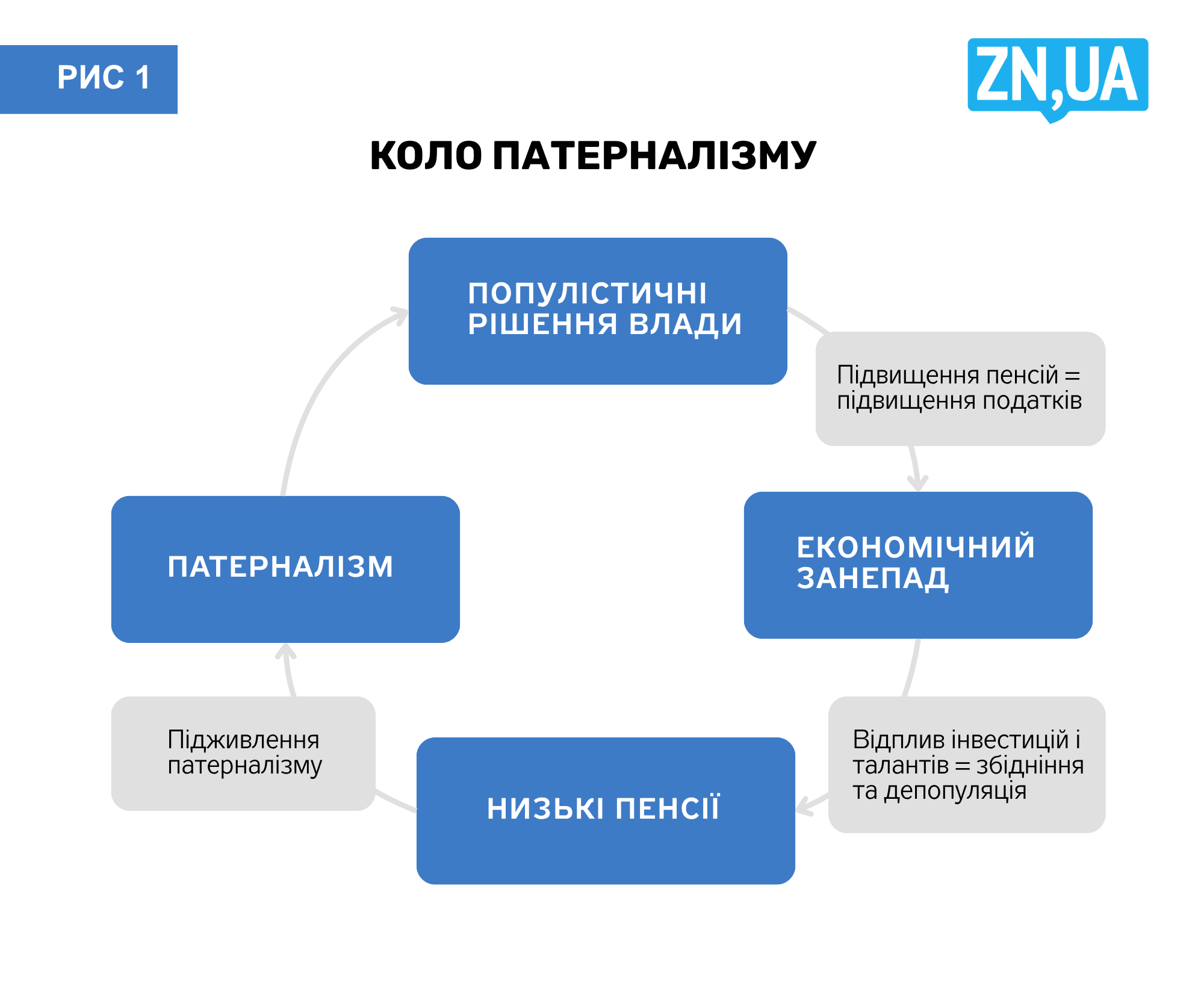 Низькі пенсії — це результат рішень, ухвалених у минулому обраною нами ж владою. Обиралася вона через нестачу критичного мислення та економічної грамотності суспільства. І от ми вже у замкненому колі патерналізму та занепаду (див. рис. 1).