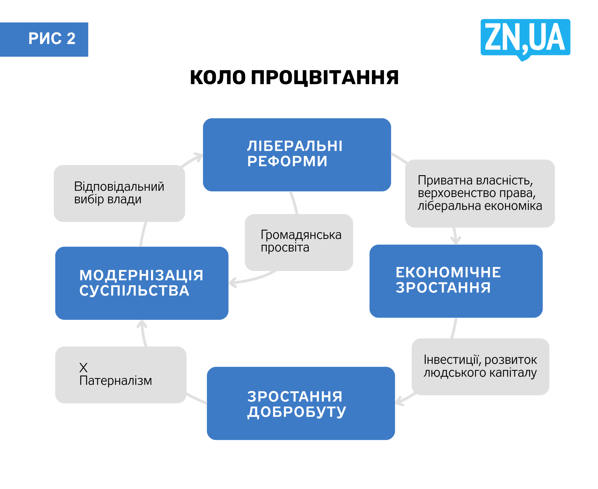 Вихід із цієї ситуації можливий лише через модернізацію суспільства та стрімке економічне зростання. На рис. 2 зображене коло, яке веде до процвітання.