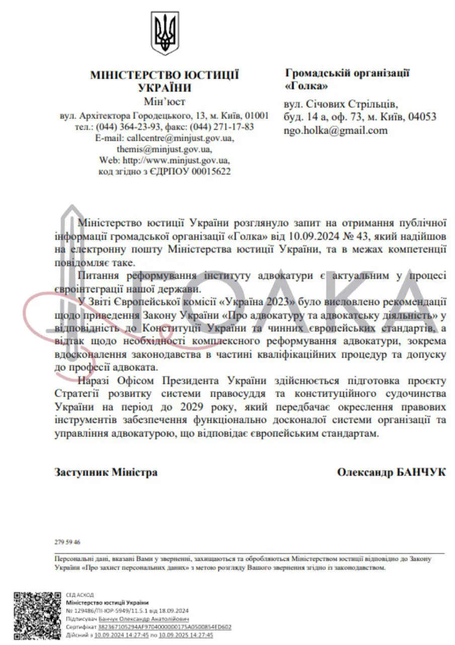 «У звіті Єврокомісія висловила рекомендації щодо приведення Закону України «Про адвокатуру та адвокатську діяльність» у відповідність до Конституції України та чинних європейських стандартів. А відтак щодо необхідності комплексного реформування адвокатури. Наразі офісом президента України здійснюється підготовка стратегії розвитку системи правосуддя та конституційного судочинства України на період до 2029 року, який передбачає окреслення правових інструментів забезпечення функціонування досконалої системи організації та управління адвокатурою, що відповідає європейським стандартам», – повідомив заступник міністра Олександр Банчук.