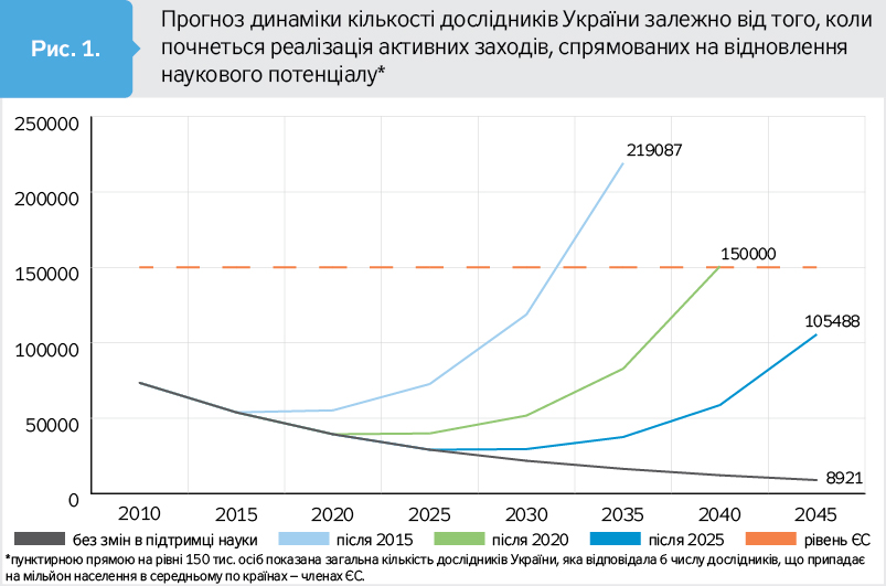 Представлені на рис. 1. результати наших розрахунків свідчать: якщо вдасться, починаючи з 2020 року, організувати таке зростання престижності наукової професії (природно, з відповідним забезпеченням розширення штатних розписів), яке б давало щорічне збільшення молодіжного поповнення на 15%, порівняно з попереднім роком, то вихід на рівень ЄС можливий у 2040 р. А якщо відтермінувати початок такої політики ще на 5 років, то такого результату навряд чи слід очікувати впродовж першої половини ХХІ століття.