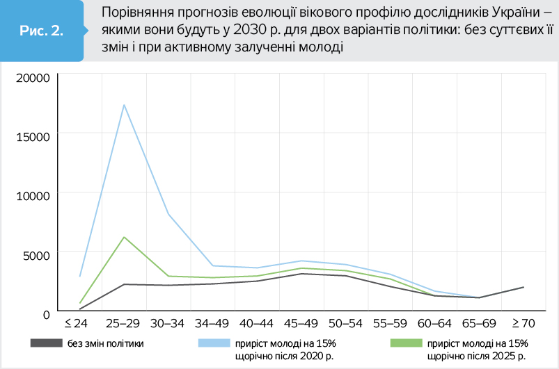 При форсованому темпі наростання молодіжного поповнення, якби воно почалося відразу після 2015 року, можна було б сподіватися, що десь у 2032 році Україна впритул наблизиться до показника наукового забезпечення інноваційного розвитку своєї економіки, який у 2013 році мали в середньому країни-члени ЄС: 3388 дослідників на мільйон населення.