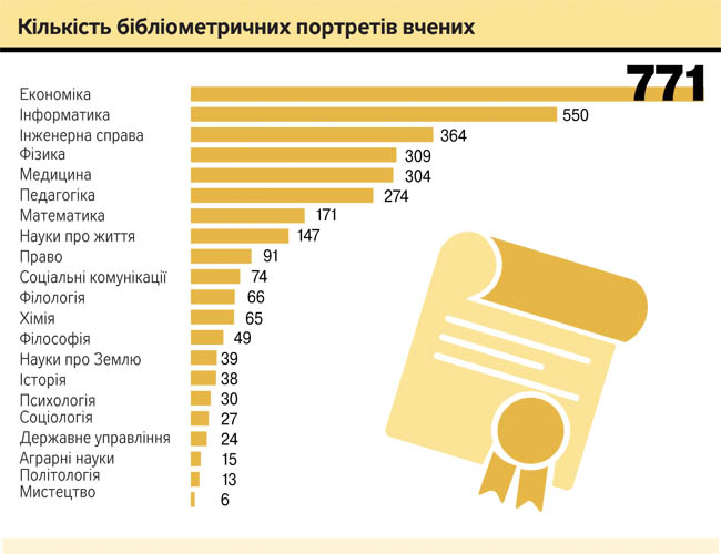 Діаграма 1 свідчить про значну перевагу спеціалістів економічного профілю - їх удвічі більше, ніж науковців з інженерної справи (машинознавців, енергетиків, будівельників). Аналіз сукупності бібліометричних портретів економістів показує, що більшість їх створено науково-педагогічними працівниками вищих навчальних закладів. Така картина обумовлена, зокрема, усталеною тенденцією до розширення економічних інститутів, факультетів і кафедр навіть у технічних університетах. Вважаємо, що МОН України має звернути увагу на цю диспропорцію, оскільки чимало новоспечених "менеджерів" не зможуть працювати за набутою спеціальністю.