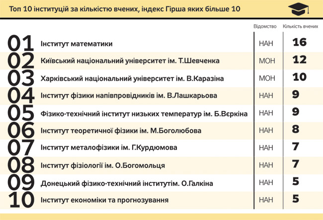 "Бібліометрика української науки" дозволяє порівняти результативність дослідницької діяльності не лише осіб, а й інституцій. Нижче наведено Топ 10 установ за кількістю вчених з високим індексом цитування (див. діаграму 2). Серед них 8 інститутів НАН України і 2 університети: Київський національний університет імені Т. Шевченка та Харківський національний університет ім. В. Каразіна. Такий результат очікуваний - наукові школи формуються кількома поколіннями дослідників і не можуть виникнути в новостворених установах, навіть попри значні інвестиції в їх інфраструктуру.