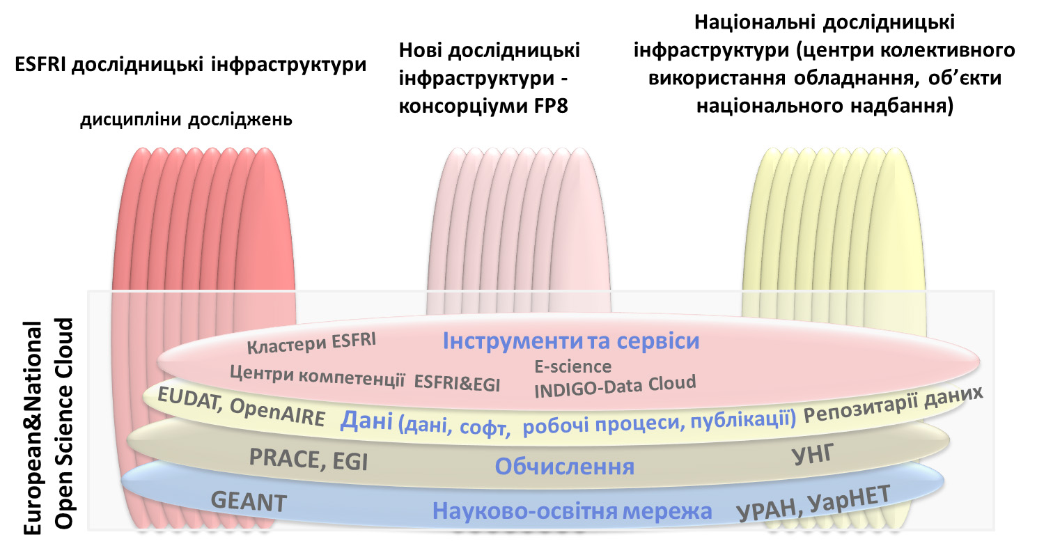 "Листками шоколаду в багатошаровому торті" є дослідницькі інфраструктури в певній науковій дисципліні, назвемо їх "вертикальними" дослідницькими інфраструктурами, на відміну від багатодисциплінарних "горизонтальних" е-інфраструктур. "Вертикальні" дослідницькі інфраструктури, з одного боку, використовують багатодисциплінарні "горизонтальні" е-інфраструктури ("шари торту"), а з іншого - надають тематичні дані, сервіси та платформи для загального використання з допомогою власної "вертикальної" цифрової інфраструктури. Вся інфраструктура такого "торту", що надається для спільного користування та управління, і є Європейська хмара відкритої науки, або e-Infrastructure Commons (термін 2013 року).