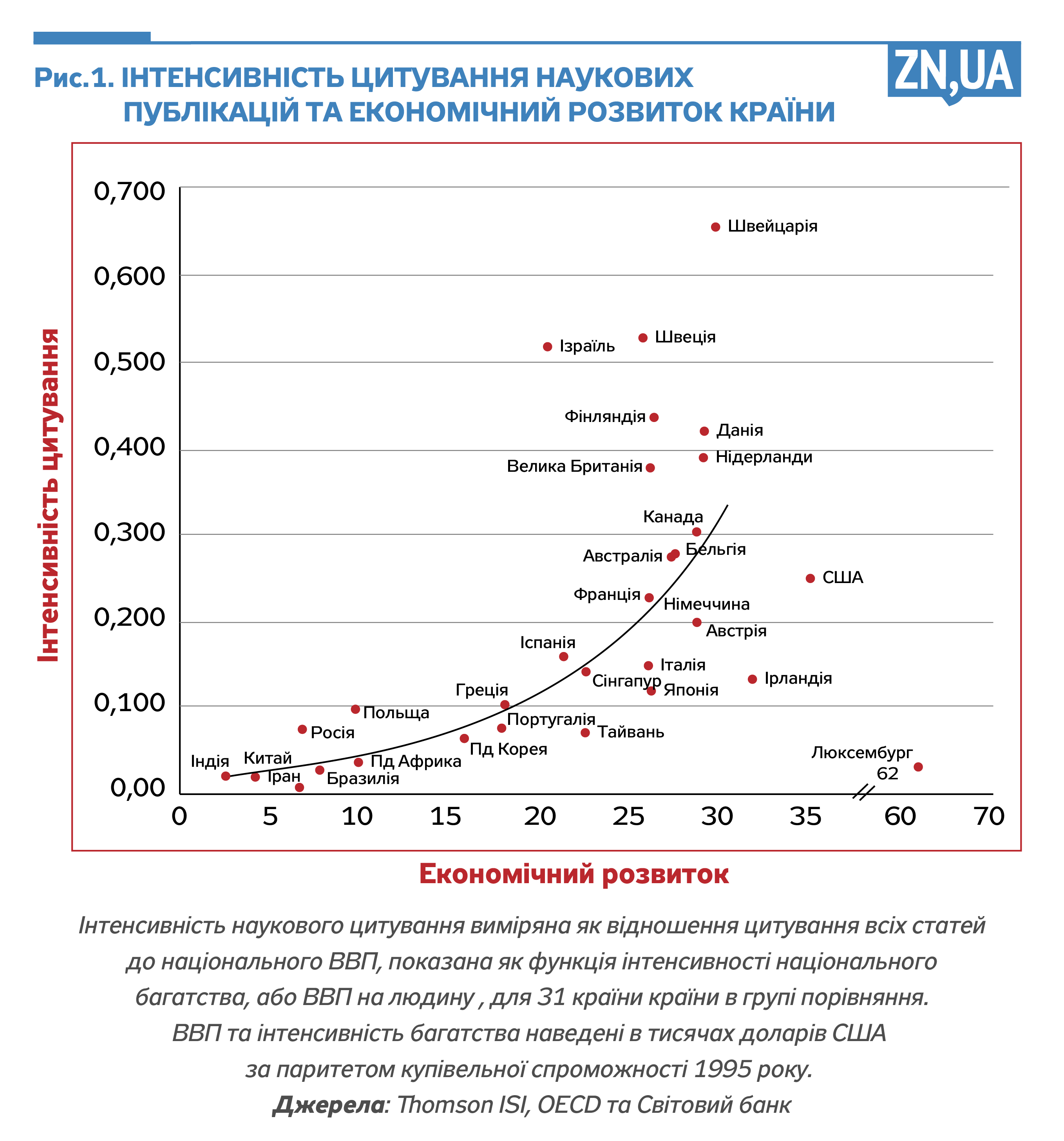 В Україні ВВП на душу населення учетверо-вп’ятеро нижчий, ніж у розвинених країнах. Можна було б припустити, що це й пояснює низькі показники наукового імпакту наших вчених, адже за загальним показником цитувань ми на 47-му місці у світі, а за кількістю цитувань у розрахунку на одну наукову публікацію — 225-ті. А наші вчені є заручниками економічної ситуації в країні. Для держави — це дуже зручне виправдання низьких обсягів фінансування науки. Та це було б так, якби ми мали витрати на науку в Україні як частку ВВП не 0,41%, а 2–3%, як у розвинених країнах світу. Тобто в нас низький рівень наукового імпакту (а саме цитованість) не тому, що ми економічно бідна країна, а тому, що в нас невиправдано рестрикційна державна політика у сфері фінансування науки.