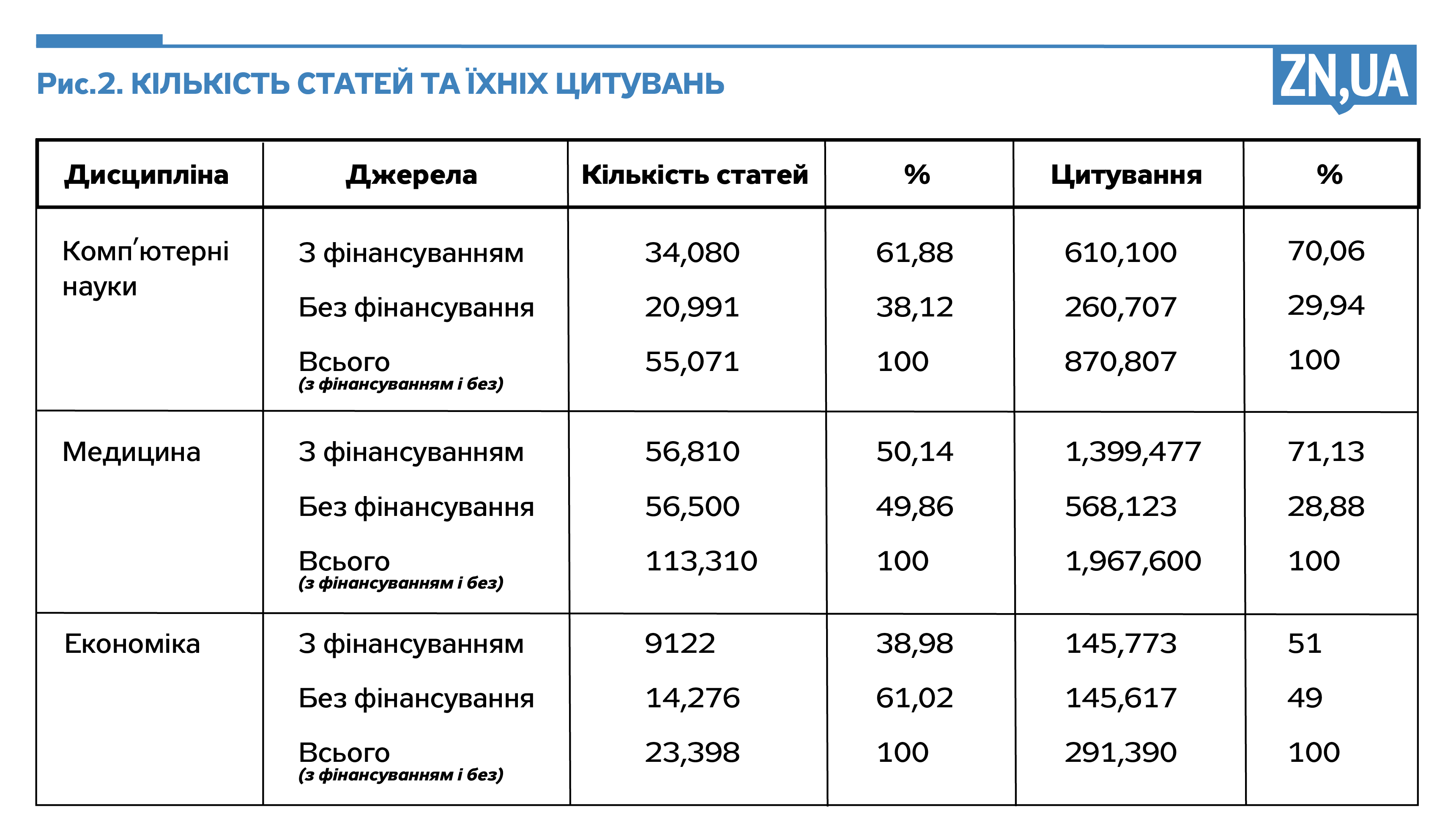 Так, у журналах з економічних наук 38,98% опублікованих статей — ті, котрі є результатом профінансованого наукового дослідження (наприклад, за рахунок гранту), при цьому на них припадає 51% усіх цитувань. У журналах із комп’ютерних наук — 61,88 з 70,6% усіх цитувань. У журналах із медицини — 50,14 з 71,13% цитувань. Результати досить цікаві, бо фіксують залежність рівня цитувань (науковий імпакт) наукового продукту (статті) вченого від доступу до фінансування наукових досліджень. Тобто доступ вченого до фінансування збільшує цитування наукового продукту — статті. Як тут знову не згадати наші мікроскопічні 0,41% ВВП на науку! Ці висновки надійні, адже базуються на аналізі понад 180 тисяч статей у більш ніж 2200 наукових журналах бази WoS.