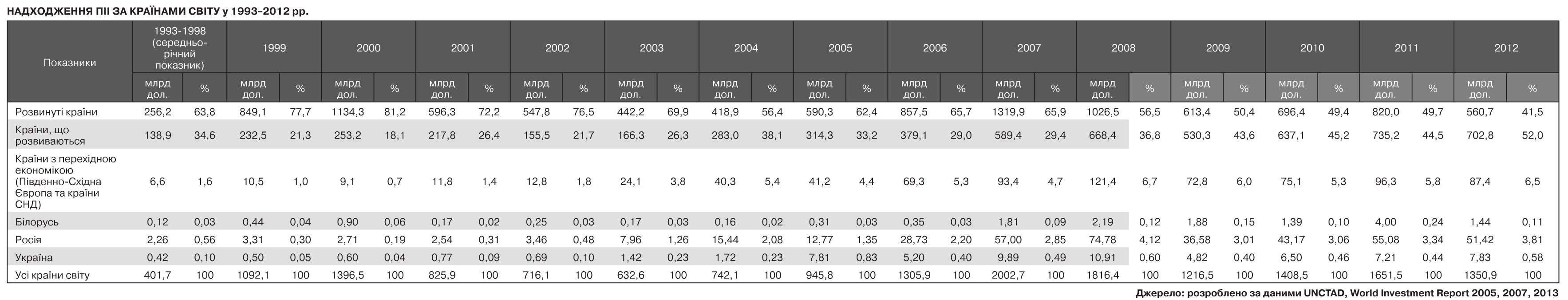 Характер динаміки питомої ваги притоку світових ПІІ в Україну трохи інший: з 1993 р. по 2008 р. вона зросла з 0,1 до 0,6%, а впродовж 2009–2012 рр. практично перебувала на одному рівні (0,47%).