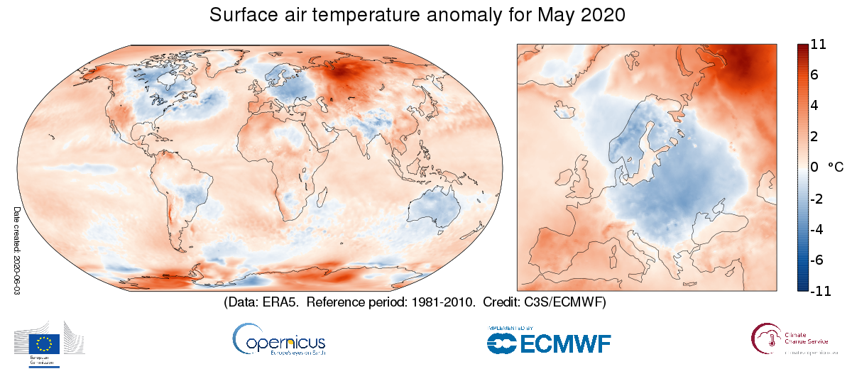 І зараз ми дивимося хіт-парад «найтепліших» спостережень, порівняно з періодом 1981—2010. Хоча як в Україні, так і в Європі ми мали аномально холодний травень (див. рис 2), глобальна температура у травні 2020-го на 0.63°C перевищувала середню глобальну температуру травнів у 1981—2010 роках, що дало йому право посісти перше місце серед найтепліших травнів в історії спостережень. Тож коли холодно — це зовсім не означає, що глобальна температура знижується, відчуття можуть вводити в оману. При цьому наступний місяць, червень 2020-го, за температурними показниками, на 0.53°C перевищує дані відповідних спостережень для червнів 1981—2010, що всього на 0.01°C холодніше від рекордсмена — «червня 2019 року». Але червень 2020-го для Європи характеризується не тільки температурною аномалією, а й опадами та повенями з показниками, вищими за середні.