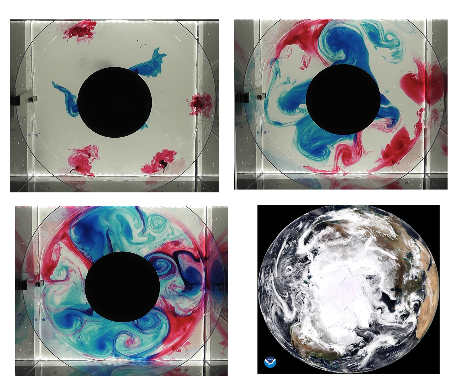 Рис. 4. Демонстрація загальної атмосферної циркуляції в обертовому басейні в «Малій академії наук». Всередині басейну— відерце з льодом, що є моделлю Арктичної області. Червона фарба — потоки теплого повітря з екваторіальних зон, а блакитна — холодні арктичні маси. Ми бачимо, як холодні «язики» з полюсів формують стійкі холодні зони попереду теплих червоних атмосферних мас, що якісно схоже на спостереження температури на рис. 2.