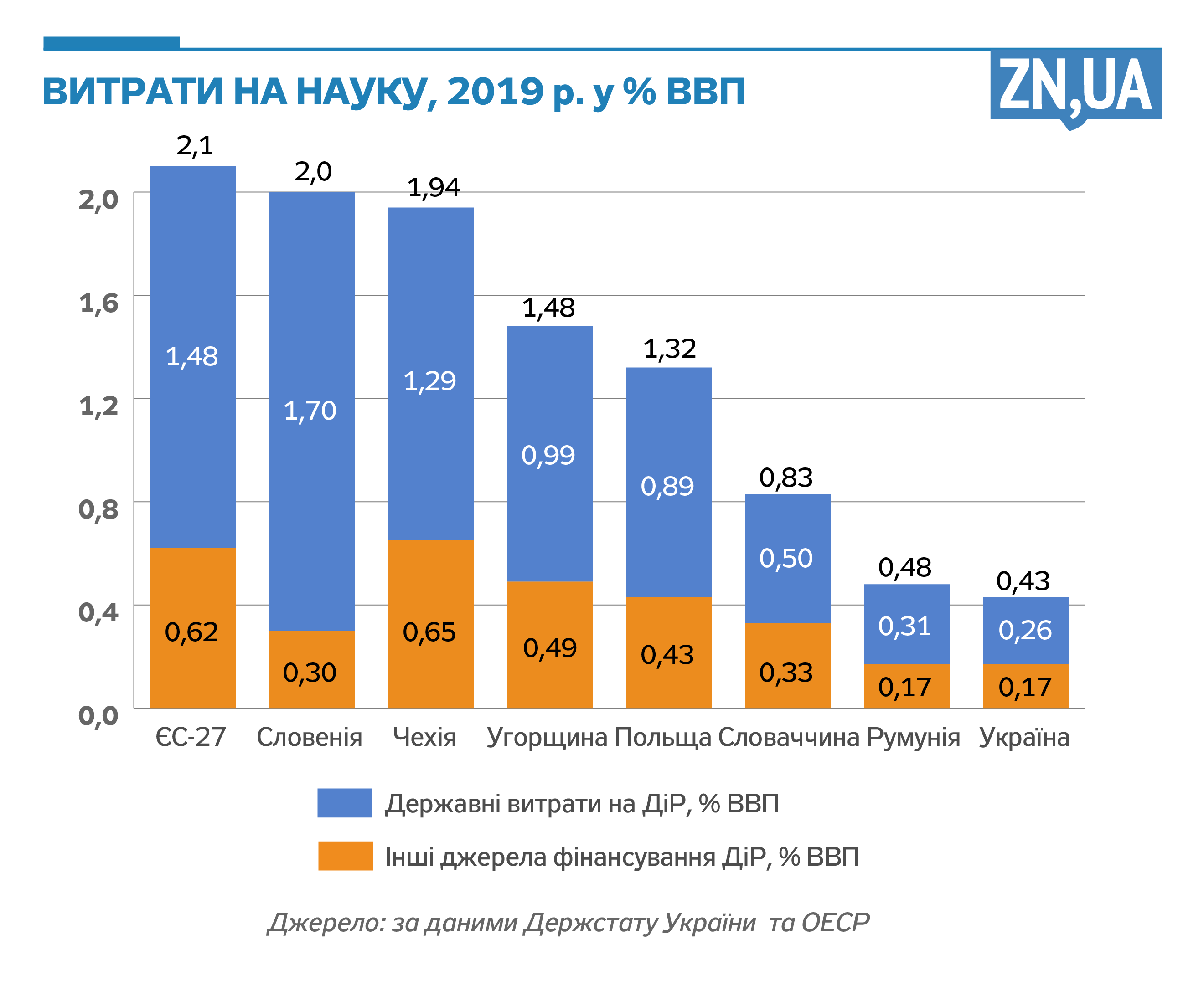 Наші найближчі сусіди (Польща, Чехія, Словаччина) мали схожі початкові умови для кардинальних змін у науковій сфері на початку 1990-х років, але в багатьох із них завдяки проведеним реформам істотно зросли якість наукових досліджень та рівень витрат на дослідження і розробки (ДіР). Натомість в Україні витрати на ДіР у відсотках ВВП впали, порівняно з показниками 1991 року, у 5,5 разу.