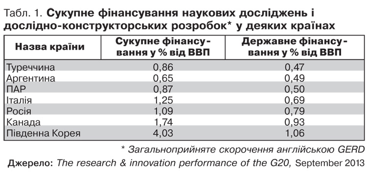 Окремо слід сказати про багаторічні заклинання представників наукової еліти (кортить узяти це слово в лапки) про легендарні 1,7% ВВП на науку, яких жоден уряд не може забезпечити. Справді, цю цифру закладено у відповідному законі, проте вона включає і НЕбюджетне фінансування. І тут виникає важливе запитання - а яку, власне, частку повинна фінансувати держава? Очевидно, в умовах, коли колишнє "народне господарство" зазнало тотальної приватизації, абсолютну більшість прикладних наукових розробок повинен фінансувати приватний бізнес, а не держава. Єдиний великий виняток - розробки для зміцнення обороноздатності України. Але, як тепер стало абсолютно очевидно, ними серйозно ніхто не займався. В часи СССР держава просто зобов'язувала підприємства виділяти певну частину прибутків "на науку". Наші наукові генерали це добре знають, і було би логічно, аби вони не волали "Державо, дай грошей!", а лобіювали закони, які змушували би Ахметова, Пінчука, Коломойського та інших олігархів вкладати гроші в прикладну науку й наукові розробки. Натомість наші академіки, високопосадовці МОН і депутати-популісти регулярно вводять суспільство в оману, твердячи про позахмарні відсотки ВВП, які, мовляв, виділяють на науково-технічну сферу в інших країнах. Нижче наведено таблицю з відповідними даними, взятими з дослідження The research & innovation performance of the G20. Її опублікувало 2013 р. згадане вище агентство Reuters. Аби не стомлювати читача цифрами (більше можна легко знайти в Інтернеті), частину країн "Великої двадцятки" опускаємо (США, Індія, Китай, Німеччина), оскільки економіка цих країн незрівнянно потужніша, ніж українська.