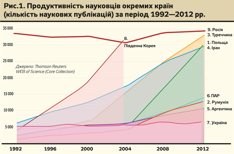 Читач легко помітить, що на початку незалежності Україна, видавши 5105 наукових праць, 1992 р. випереджала за продуктивністю всі ці країни, окрім Польщі (але й тут відставання було незначне). Більше того, виявляється, що 20 років тому наука в Ірані була в зародковому стані (262 наукові роботи в усіх галузях науки за 1992 р.), а успіхи науковців Румунії і Туреччини були просто сміховинні порівняно з нашими. І ось минуло 20 років: науковці України опублікували 6317 наукових праць (з них науковці НАНУ - майже 4300), тобто лише на 20% більше, ніж 1992 р. Темпи зростання ганебно низькі порівняно з країнами-конкурентами: тепер Україна продукує у п'ять разів (!!!) менше наукових праць, ніж Іран чи Туреччина, і майже вдвічі менше, ніж Румунія. Всі інші країни також успішно "обставили" Україну, а Південна Корея за цей час увірвалася до когорти світових лідерів: 63 341 робота в 2012 році, тобто в 10 разів більше, ніж спромоглася Україна. Абсолютно очевидний факт, що найближчими десятиліттями Україна не має жодних шансів повернути собі те місце, яке вона посідала у світовій науковій спільноті 20 років тому. На жаль, у науці значно важче зробити якісний стрибок, ніж у футболі, в якому достатньо вкласти мільярд доларів у клуб, і він уже за кілька років "гримить" в усьому світі (яскравий приклад - англійський Манчестер Сіті).