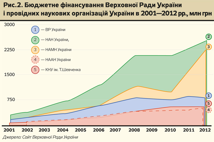 Отже, криві 2, 3, 4 і 5 показують динаміку зростання бюджетного фінансування (для допитливого читача уточнимо, що це гроші лише з загального фонду) чотирьох провідних (щодо обсягів фінансування) наукових організацій України: НАН України, НАМН України, НААН України та Київського національного університету (КНУ) ім. Т.Шевченка. Для кращого розуміння того, що фінансування збільшувалося шаленими темпами, подано криву 1, яка відображає зростання бюджетного фінансування Верховної Ради. Знаючи загальну нелюбов громадян до наших ненаситних депутатів, мабуть, ніхто не сумнівається, що себе вони ніколи не обділяли. Виявляється, це не зовсім так: вони себе явно обділили порівняно зі згаданими вище академіями наук і КНУ ім. Шевченка. Справді, за період 2001–2008 рр. зростання видатків на ВР зросло майже в 5 разів (точніше, в 4,9 разу), і сумнівно, що знайдеться якесь міністерство чи відомство, яке мало вищі темпи бюджетного фінансування. Але ж НАН, НАМН і Київський університет ім. Т.Шевченка таки мали набагато вищі темпи, а темпи зростання фінансування НААН лише трохи нижчі, ніж наших депутатів. Фінансування НАНУ й КНУ за цей період зросло до 2077 млн грн і 392 млн грн на рік, тобто майже в 7 і 6 разів відповідно. Щодо фінансування НАМН, то тут спостерігається подальше фантастичне зростання ще й в епоху Януковича, коли фінансування інших академій практично заморозили. Мабуть, академіки-медики пообіцяли Януковичу відкрити секрет вічної молодості.
