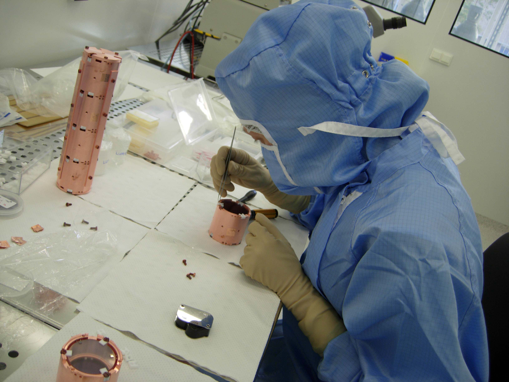 Мал.2 Монтаж кристалів виконала Анастасія Золотарьова. Захистивши магістерський диплом в ІЯД НАН України, Анастасія захистила дисертацію у Франції і тепер отримала позицію дослідника у постдокторантурі Лабораторії фізики двох нескінченностей імені Ірен Жоліо-Кюрі Національного центру наукових досліджень Франції