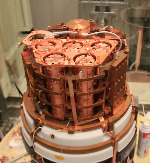 Мал.4 Збірки з кристалами молібдату літію, змонтовані у наднизькофоновому кріостаті в підземній лабораторії Модан у Франції. Для нормальної роботи кристали необхідно охолодити до температури близько двох сотих градуса вище абсолютного нуля, оточити товстим шаром захисту і розмістити глибоко під Землею