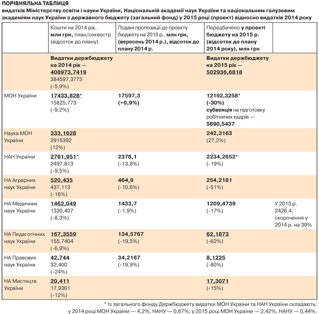 Голова парламентського комітету Лілія Гриневич зазначила, що в бюджеті на 2015 рік різко скорочено витрати на науку і освіту. Так, МОН, НАНУ і галузевим академіям видатки з загального фонду державного бюджету України на 2015 рік зменшено порівняно з 2014 роком на 28%. Особливо драматична ситуація з фінансуванням галузевих академій (див. табл.) На 27% скорочуються видатки на науку ВНЗ.