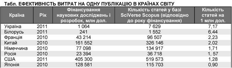 Останнім часом у численних дискусіях ефективність української науки оцінюється із застосуванням стандартних наукометричних методів. Мені здається, що доцільно подивитися на цю проблему з іншого боку. Якщо перерахувати ефективність витрат на одну публікацію, то загальна картина матиме такий вигляд: віддача вітчизняних учених на 1 дол. вкладень у науку в 5 разів більша, ніж учених США і в 7 разів більша за віддачу японських колег. Як показник ефективності взято кількість наукових публікацій у країні, зареєстрованих у базі статей SciVerse Scopus, у розрахунку на 1 млн дол. сукупного фінансування (державного й приватного) науки в країні.