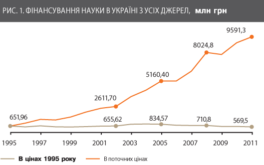 У виступах представників влади найчастіше підкреслюється, що фінансування української науки постійно збільшується. Однак цифри, які наводяться, зазвичай не враховують інфляції. Порівняння статистичних даних про фінансування науки в Україні за період 1995-2011 рр. з використан-ням дефлятора, розрахованого Ігорем Булкіним (ЦДПІН