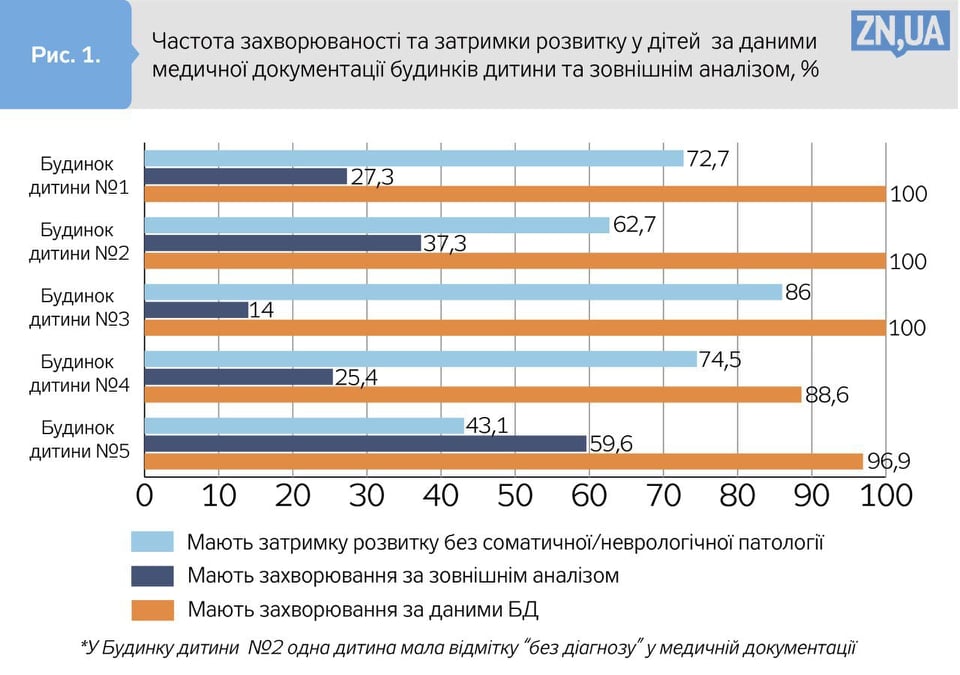 Дві третини дітей у будинках дитини — здорові, тобто в них немає соматичних і неврологічних захворювань. Як з’ясувалося, багато діагнозів —«міфічні» (спірні). Наприклад, «гіпертрофія мигдаликів», «вальгусна деформація стопи», зазначені як діагнози в медичній документації, такими не є, оскільки це — анатомічні особливості розвитку, характерні для певного віку дитини. Дуже часто немає достатньо підстав для встановлення того чи іншого діагнозу, наприклад такого поширеного як «гідроцефальний синдром».