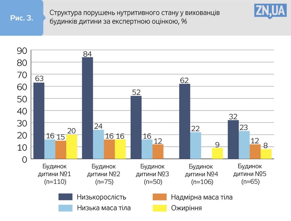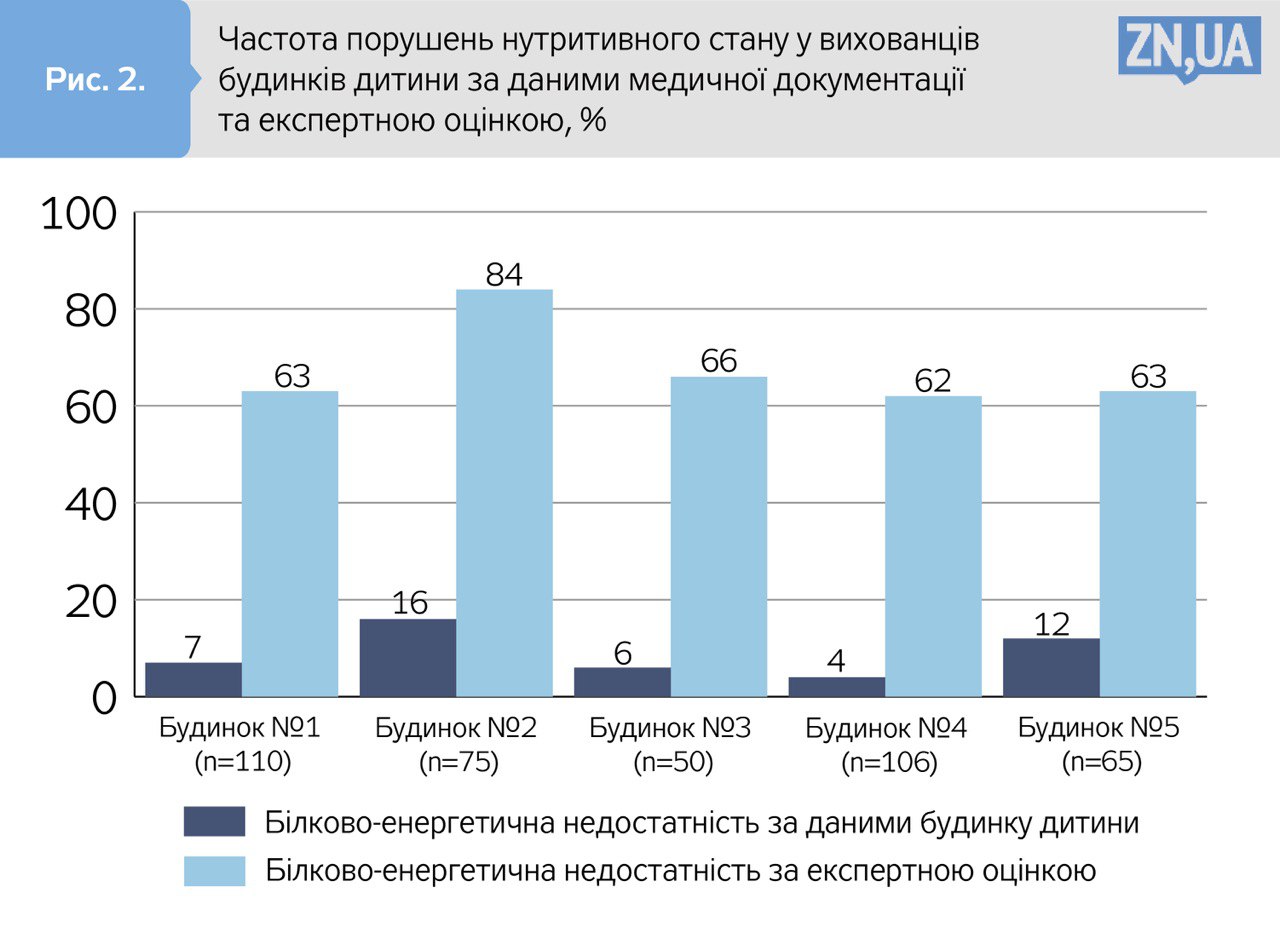 Понад 60% дітей, а в одному будинку дитини — понад 80% мають білково-енергетичну недостатність. Це означає, що діти не отримують належного харчування з необхідною кількістю макронутрієнтів, мають порушення харчової функції, занижену масу тіла, порушення обміну речовин і схильні до розвитку інших захворювань та затримки фізичного і нервово-психічного розвитку.