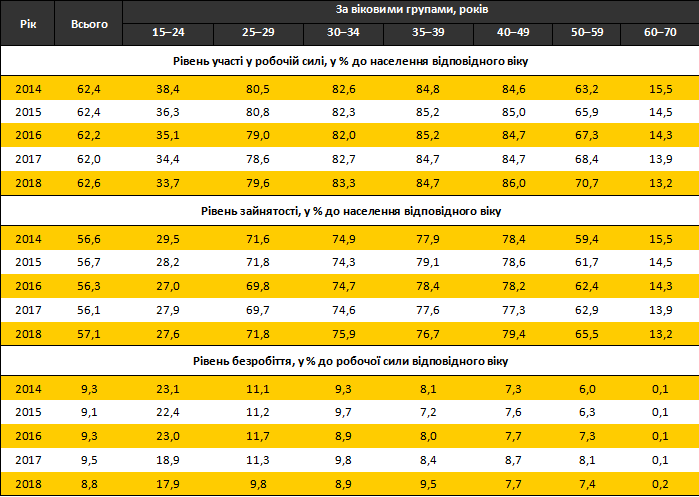 Крім того, що молодь віком 15–24 роки має дуже малу загальну чисельність, це єдина вікова група, яка в останні п'ять років демонструвала стале зменшення рівня своєї участі у робочій силі: з 38,4% у 2014 році до 33,7% у 2018-му (див. табл.). Причому рівень участі зменшувався за рахунок зниження як рівня безробіття (з 23,1 до 17,9%), так і рівня зайнятості (з 29,5 до 27,6%).