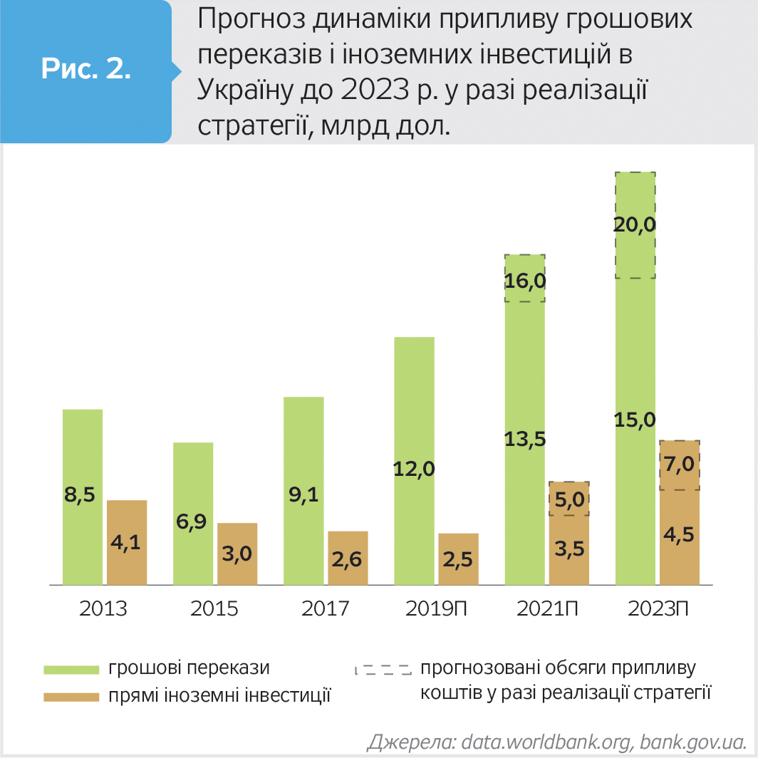 Досвід інших країн показує, що, реалізуючи стратегії повернення своїх мігрантів і діаспори через мотивацію залучення їхніх переказів та інвестицій, можна суттєво збільшити приплив цих фінансових ресурсів. Це, у свою чергу, веде до зростання іноземних інвестицій в Україну. Саме цей шлях за 1960–1990 рр. пройшли Туреччина, Ізраїль, Португалія, Південна Корея,а також Ірландія. Спочатку перекази мають споживчий характер, потім інвестиційний. Спочатку діаспора сама вкладає кошти в країну, а потім "підтягує" іноземних інвесторів для розширення припливу інвестицій. Саме діаспора є провідником іноземного капіталу в країну. Тому ми спрогнозували, що у разі реалізації цієї стратегії обсяги переказів можуть зрости до 20 млрд дол. на рік, що дуже важливо для подальшого поповнення ЗВР України. Це також пришвидшить і зростання іноземних інвестицій до 7 млрд дол. на рік (див. рис. 2).