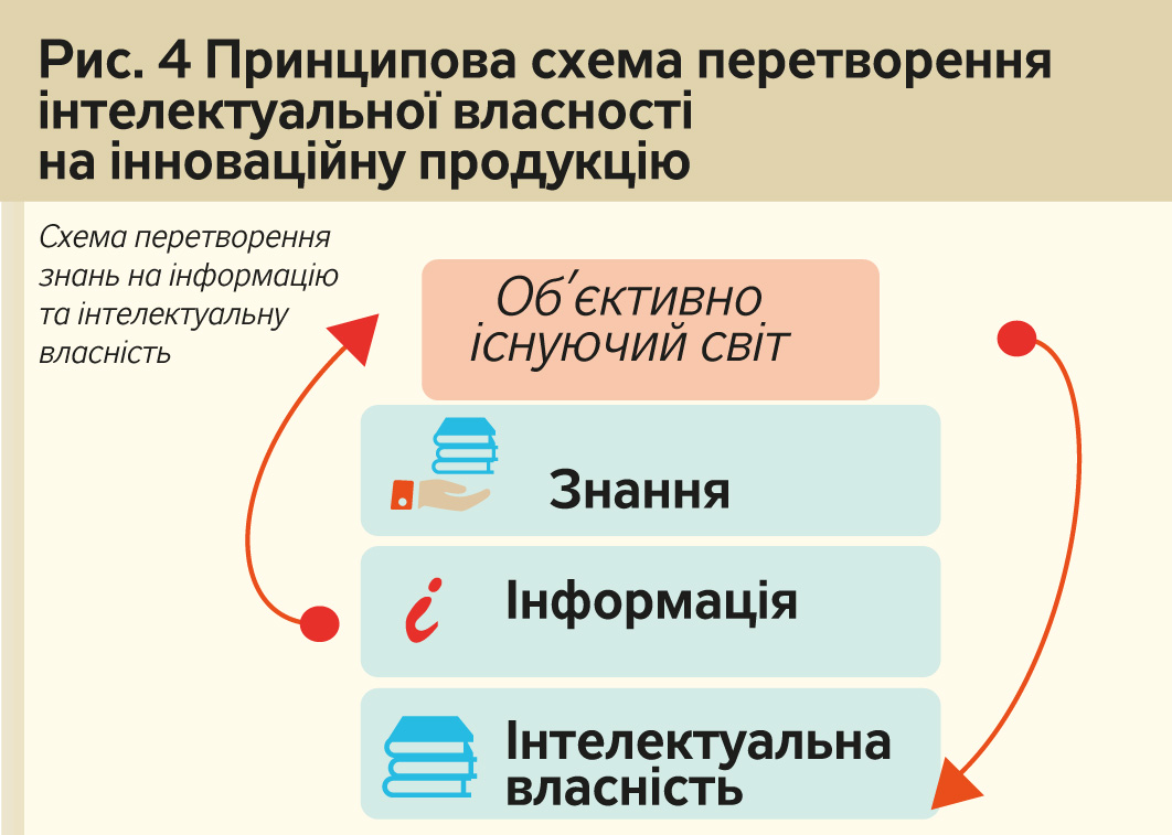 Усі результати інтелектуальної праці умовно можна розділити на три групи: знання, інформація та інтелектуальна власність (див. рис. 4).