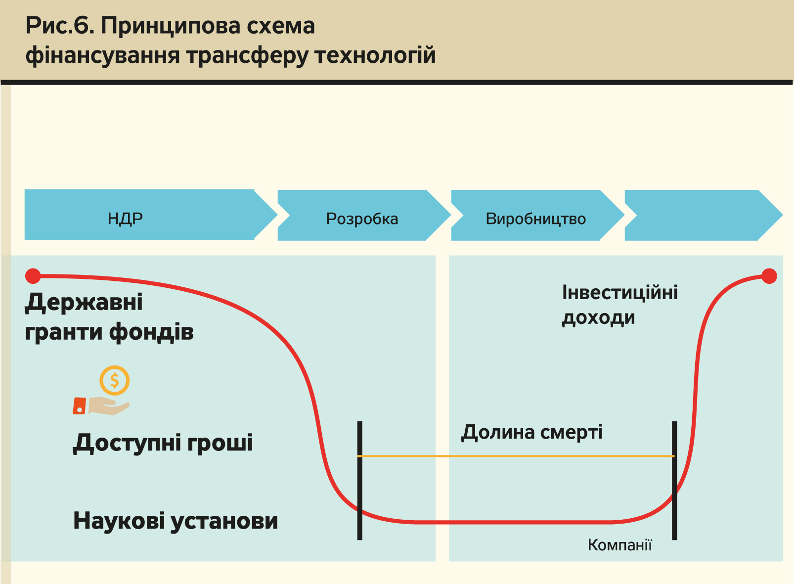 Бізнес заходить зі своїми грошима переважно на етапі реалізації, коли бачить готову продукцію. Він не має намірів фінансувати етапи виробництва, а тим більше - розробки, оскільки це пов'язано з великими ризиками, а завдання бізнесу - отримати максимальний прибуток при мінімальних ризиках. Отже, наука хоче, але не може фінансувати етапи 2 і 3, оскільки не має для цього коштів. А бізнес має, але не хоче фінансувати ці етапи, бо це пов'язано з великими ризиками. І тому між наукою і бізнесом виникає провалля, так звана долина смерті. Через це результати наукових досліджень осідають "на полиці", а інноваційний процес припиняється.