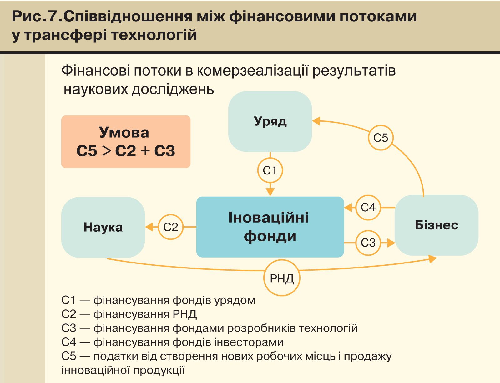 Тому насамперед потрібно створювати державні фонди (підтримувані також приватними інвесторами), які б фінансували прикладні дослідження та підтримували малий інноваційний бізнес. Частково розв'язання цієї проблеми пропонується у проекті ЗУ "Про наукову і науково-технічну діяльність", яким передбачено створення на місці нинішнього малопотужного Державного фонду фундаментальних досліджень значно потужнішого Національного фонду досліджень, який фінансуватиме на грантовій основі як фундаментальні, так і прикладні дослідження. В рамках реалізації програми уряду міністерство розробило й проекти змін до чотирьох законів, які регулюють інноваційну діяльність і трансфер технологій. Ці проекти, що проходять нині стадію громадського обговорення, передбачають відновлення можливостей венчурного фінансування і визначають шляхи наповнення коштами відповідного державного інноваційного фонду. Подібні фонди мали би створюватися в регіонах. Важливо, щоб виконувалося показане на рис. 7 співвідношення фінансових потоків.