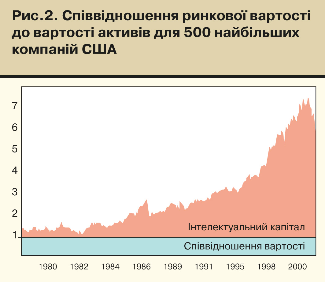 У таких компаніях за останні десятиріччя спостерігається експонентне збільшення співвідношення між їхньою ринковою вартістю і вартістю їхніх активів. Так, для 500 найбільших компаній США це співвідношення збільшилося від одиниці в 1980 р. до семи в 2000-му. Тобто в семи доларах вартості компаній їхні активи становлять лише один долар (див. рис. 2).