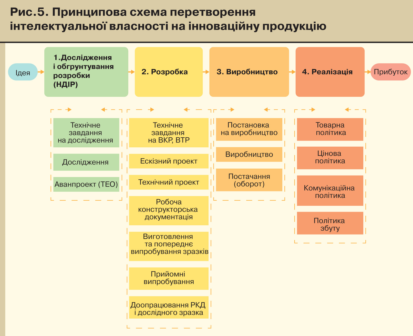 На рис. 5 показано принципову схему руху від інноваційної ідеї до реалізації інноваційної продукції на ринку. Але на практиці цей процес, який зазвичай називають трансфером технологій, набагато складніший. Об'єкт інтелектуальної власності може виникнути не тільки на першому, а й на другому, третьому і навіть четвертому етапі.