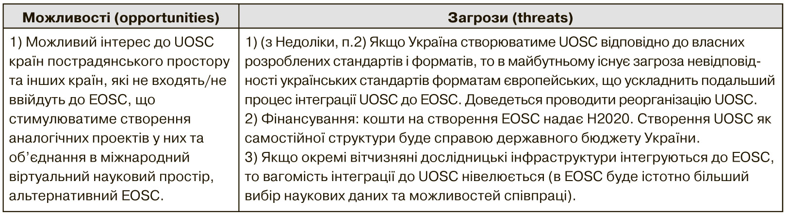 Нижче наведено SWOT-аналіз щодо створення UOSC як організації, аналогічної EOSC.