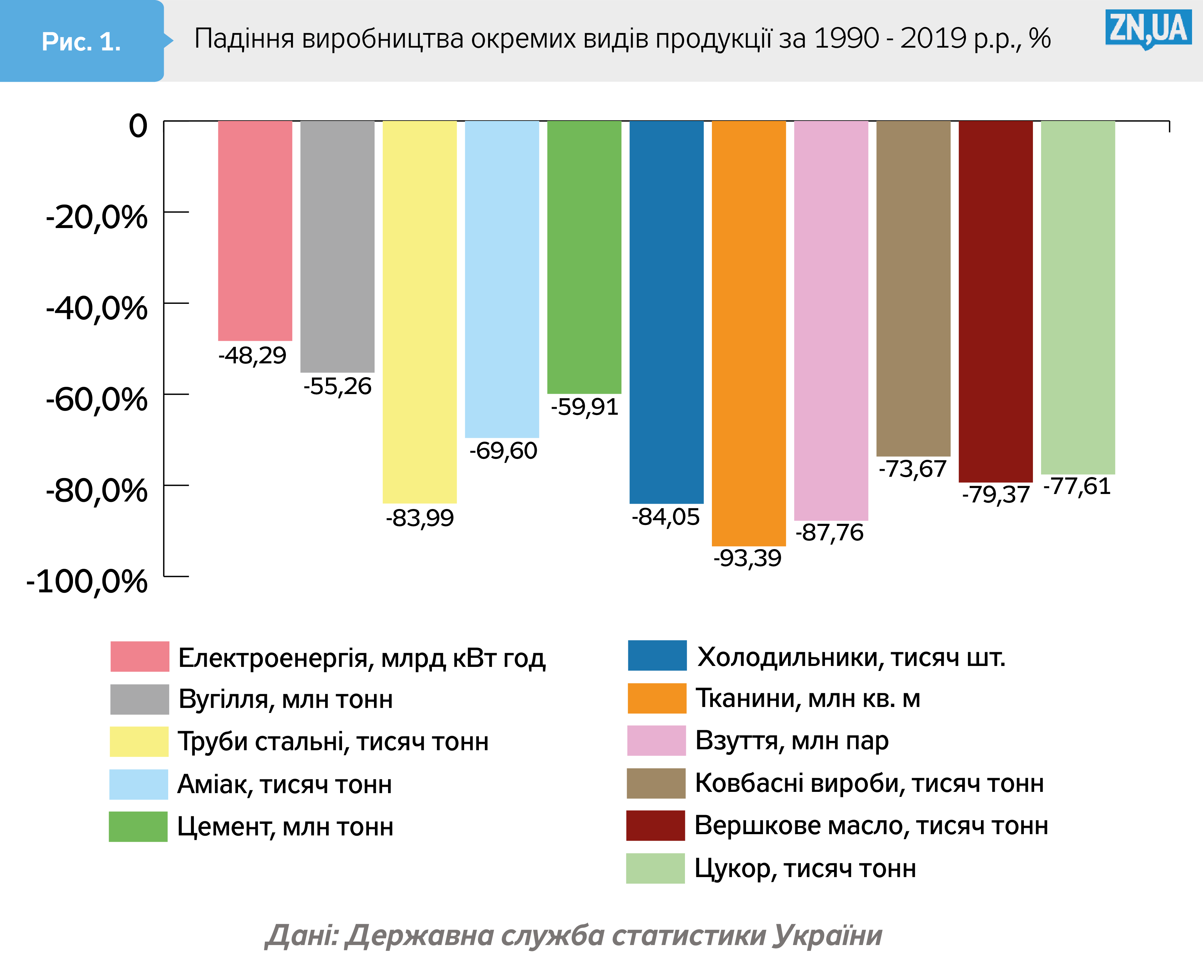 Встигли багато чого. Експортні обмеження прибрали тільки 1995-го, а ціни на внутрішньому ринку продовжували регулювати до кінця 1996-го. Цього було досить для того, аби поховати багато секторів, наприклад, 1990-го сталевих труб в Україні виробили близько 6,5 тис. тонн, а 1995-го — 1,5 тис., цементу 1990-го — майже 23 млн тонн, а 95-го — 7,5 млн, тканин 1990-го в Україні виготовили 1,2 млрд кв. м, а 1995-го — 169 млн (див. рис. 1).