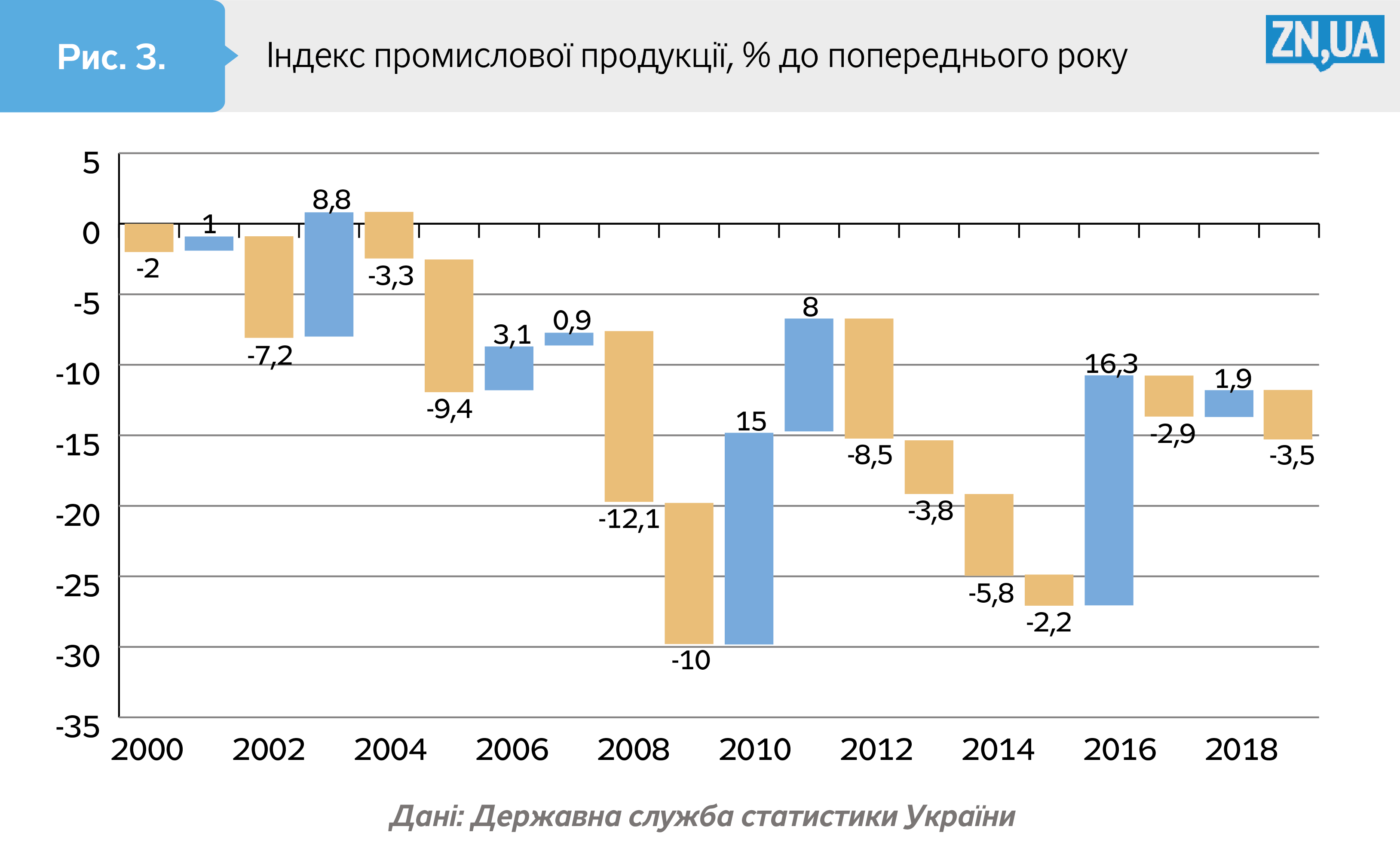 Усі ці роки українські уряди наполегливо підтримували обрані сектори та галузі то пільгою, то преференцією, то індустріальним парком, то вільною економічною зоною. Ми побудували цілу систему інкубаційного вирощування олігархату ціною недоотриманих податків, нерозвиненої конкуренції та виробничої відсталості. Мало який прем’єр не казав про «точки зростання», «локомотиви економіки», «драйвери» та іншу нісенітницю. Ми порівняли галузеві індекси промвиробництва 1990-х і 2000-х. Рідкісний «драйвер» не впав за цей час на менш як 50% (див. рис. 2).