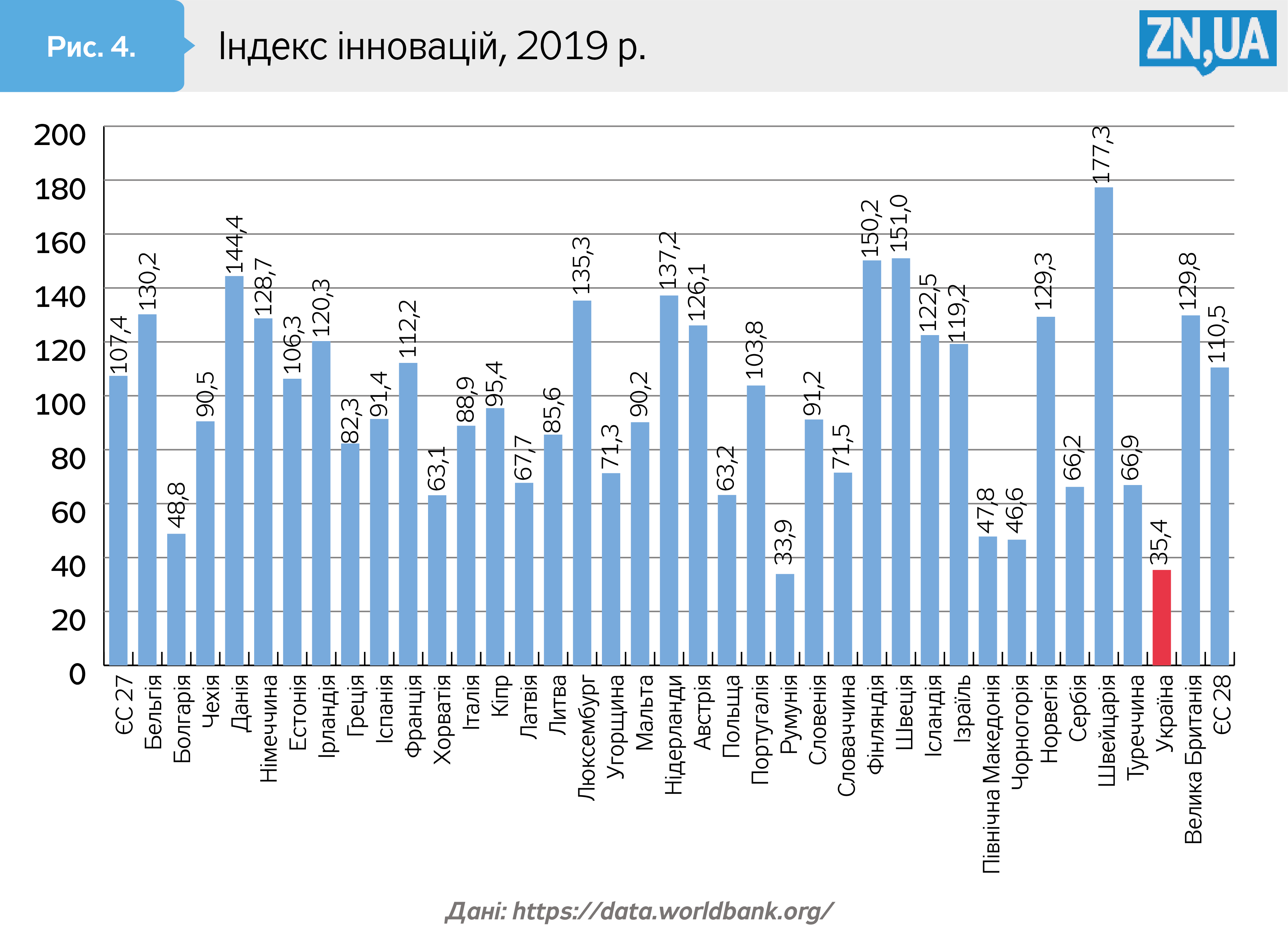 І поки прогресивне людство прагне перейти до шостого технологічного укладу з нанотехнологіями, наноматеріалами, біоінженерією та когнітивними науками, ми тупцюємо в третьому технологічному укладі минулого століття, до якого належать понад 50% усіх вироблених нами товарів, і навіть не намагаємося ступнути далі. При цьому в нас не бракує ні фахівців із вищою освітою, ні докторів наук, ні кількості щорічно зареєстрованих патентів, от тільки кількість у якість не переходить. Європейська комісія щороку дає порівняльну оцінку розвитку досліджень та інновацій у Європі — індекс EIS. Наш показник там незмінний з 2012 року — 35–36 балів. Для порівняння, у сусідній Польщі індекс інновацій 2012-го був 51 бал, 2019-го — уже 63, а в лідируючої нині у рейтингу Швейцарії індекс виріс із 146 балів 2012-го до 177 — 2019-го (див. рис. 4). І не стільки лякає наша відсталість, скільки відсутність будь-якого прогресу за останні сім років. Навіть не намагаємося.