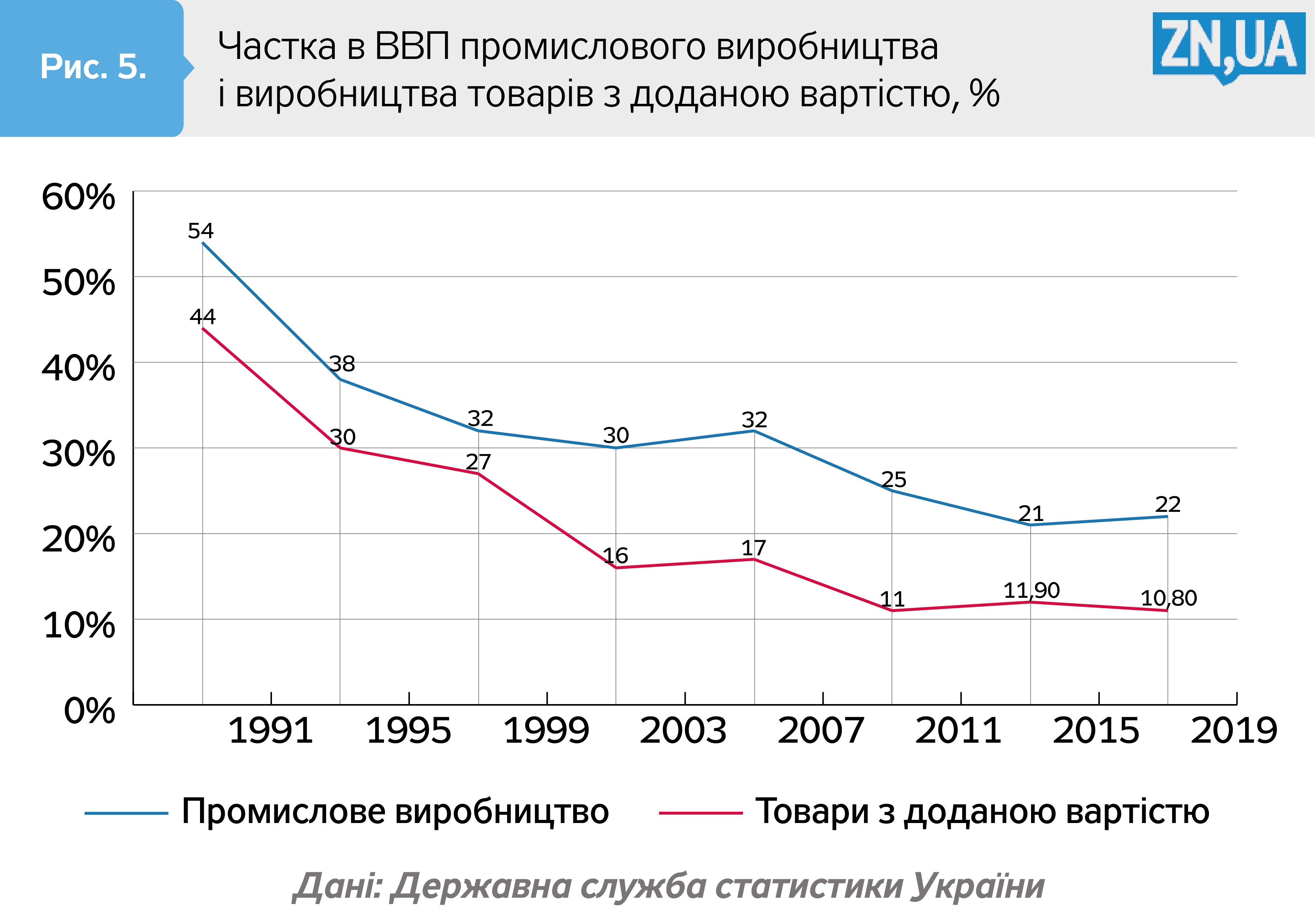 Тож і частка промисловості в нашому ВВП, і частка товарів з доданою вартістю планомірно знижувалися всі ці 29 років (див. рис. 5), поступаючись місцем сільському господарству. Щось точково ми ще зможемо відновити, десь зайняти нові ніші, наприклад, розширити експорт послуг, зробити ставку на розвиток IT-індустрії, яка вже дає 4% ВВП і 20% експорту послуг. Але глобально ситуація не змінюватиметься — подивіться на пріоритети наших нових прогресивних урядів: зовнішні інвестиції та підтримка, дороги, робочі місця, податкові пільги, приватизація та хронічні спроби щільніше обкласти податком тих самих IT-шників, за якими майбутнє… Третій технологічний уклад не тільки в нас за вікном, він у нас у головах.