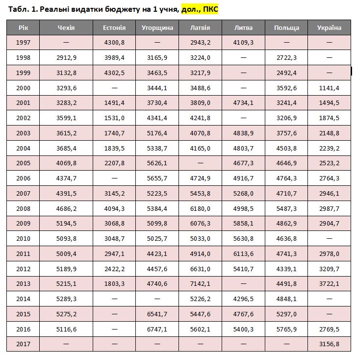 Темпи зростання видатків на освіту у 2000-х в Україні були співмірні з аналогічним показником у сусідніх постсоціалістичних європейських країн, якщо враховувати паритет купівельної спроможності. Однак стартові позиції України після 1990-х виявилися настільки низькими, що ми так і не змогли наздогнати їх: нині в Україні видатки на одного учня удвічі-втричі нижчі від центральноєвропейських.