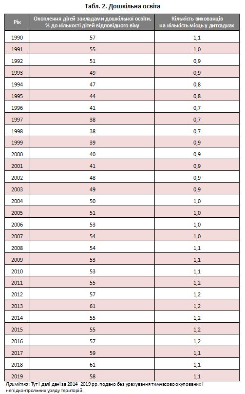 Дошкілля миттєво відреагувало на зменшення кількості вихованців: згортання кількості дитсадків почалося вже у 1991 році і тривало до 2004-го, коли їх лишилося майже на 40% менше, ніж було у 1990-х. Причина такої стрімкої адаптації — фінансова. На відміну від середньої освіти, дошкільна фінансувалася лише з місцевих бюджетів, та ще й не була обов’язковою. Відтак в умовах економічної кризи садки першими пішли «під ніж».
