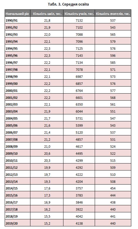 У середній освіті ситуація була інакша. У школах між 1990-м та 2013 роками стало на 40% дітей менше, однак кількість закладів зменшилася лише на 12%, а кількість учителів — взагалі, лише на 5%. Це означає, що розмір класів значно скоротився і на вчителя тепер припадає істотно менше учнів, ніж припадало в першій половині 1990-х. Таким чином, у перерахунку на одного учня, навчання однієї й тієї ж кількості дітей обходиться значно дорожче: адже зарплата вчителя, який працює із класом на 35 учнів, і того, хто має справу з п’ятьма дітьми, однакова.