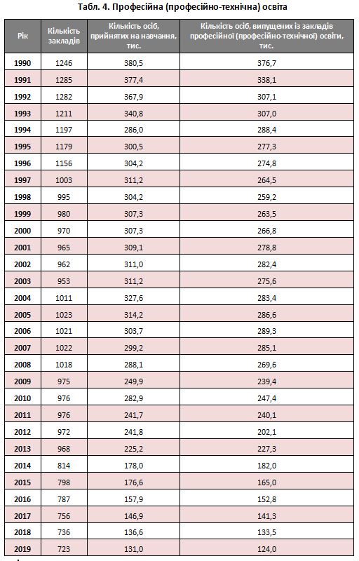 Заклади професійної (професійно-технічної) освіти також зменшилися і кількісно, і розміром. З 1990-го по 2013-й профтехів стало менше на 22%. Але студентів у них поменшало на 40%. Причому їх продовжувало меншати навіть у той період, коли загальна кількість випускників 9-х класів почала знову зростати. Однак із початку 2000-х частка учнів, які після 9-го класу продовжували навчання в загальноосвітніх школах, зросла до 70% (тоді як у 1996-му таких був 61%). Крім того, дедалі більше випускників вирішували продовжити навчання у коледжах та технікумах, які отримали статус закладів вищої освіти.