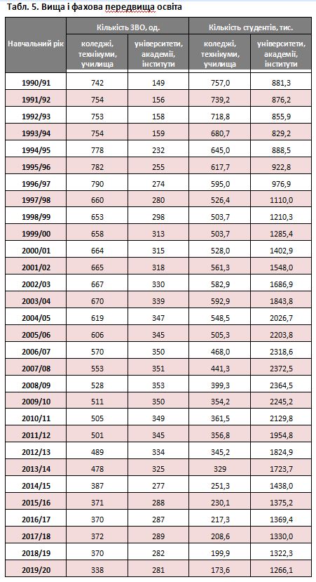 Утім, кількість коледжів, технікумів та училищ, які раніше називалися закладами вищої освіти І–ІІ рівнів акредитації, теж зменшилася, причому аж на 36%: 1990 року їх було 742, а 2013-го лишилося 478. Однак частина їх не зникла, навпаки — вони стали закладами вищої освіти. Разом із новими університетами, інститутами й академіями, кількість вишів між 1990-м і 2013-м зросла більш ніж удвічі. А кількість студентів взагалі збільшилася вражаюче: в середині 2000-х їх було у 2,7 разу більше, ніж перед отриманням незалежності.